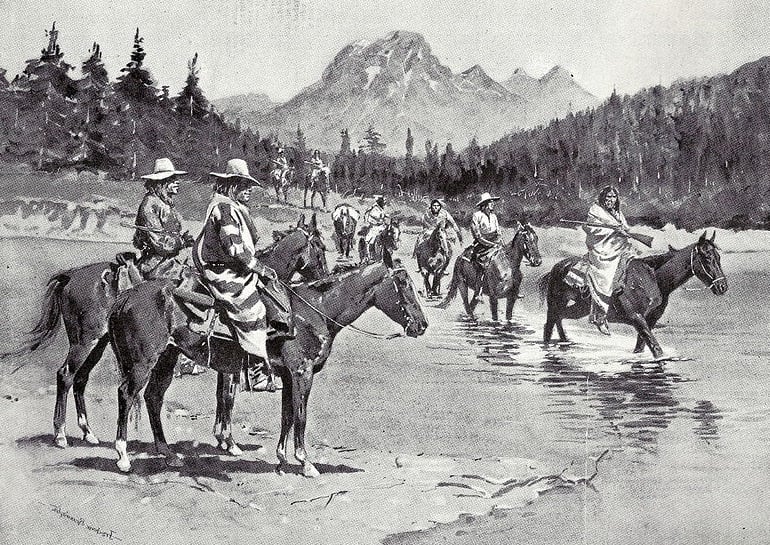 | «Недавнее восстание среди индейцев баннок. Охотничий отряд, переправляющийся через реку Снейк к юго-западу от Трёх тетонов». Заголовок Baltimore Morning Herald, 27 июля 1895 года. Фотограф — Фредерик Ремингтон. | |||